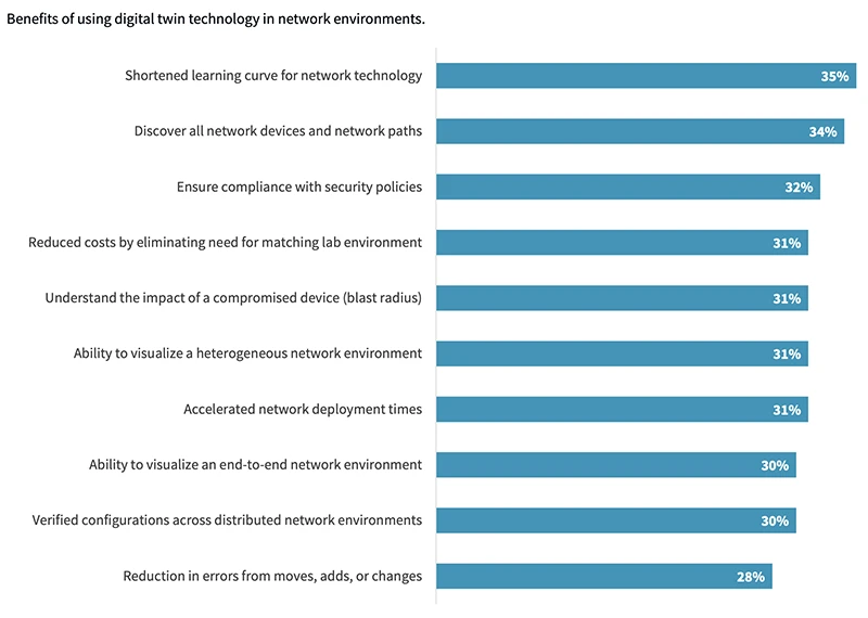 Organizations aware of digital twin technology have realized, or expect, a number of benefits. These include the ability to shorten the learning curve for network technology (35%), the ability to discover all network devices and paths (34%), and ensuring compliance with security policies (32%). Organizations also report that reducing costs by eliminating the need for a matching lab environment would be beneficial, along with being able to understand the impact of a compromised device, visualizing a heterogeneous network environment, and accelerating network deployment times. Clearly, having a digital twin of the network environment can deliver a number of benefits to its users.