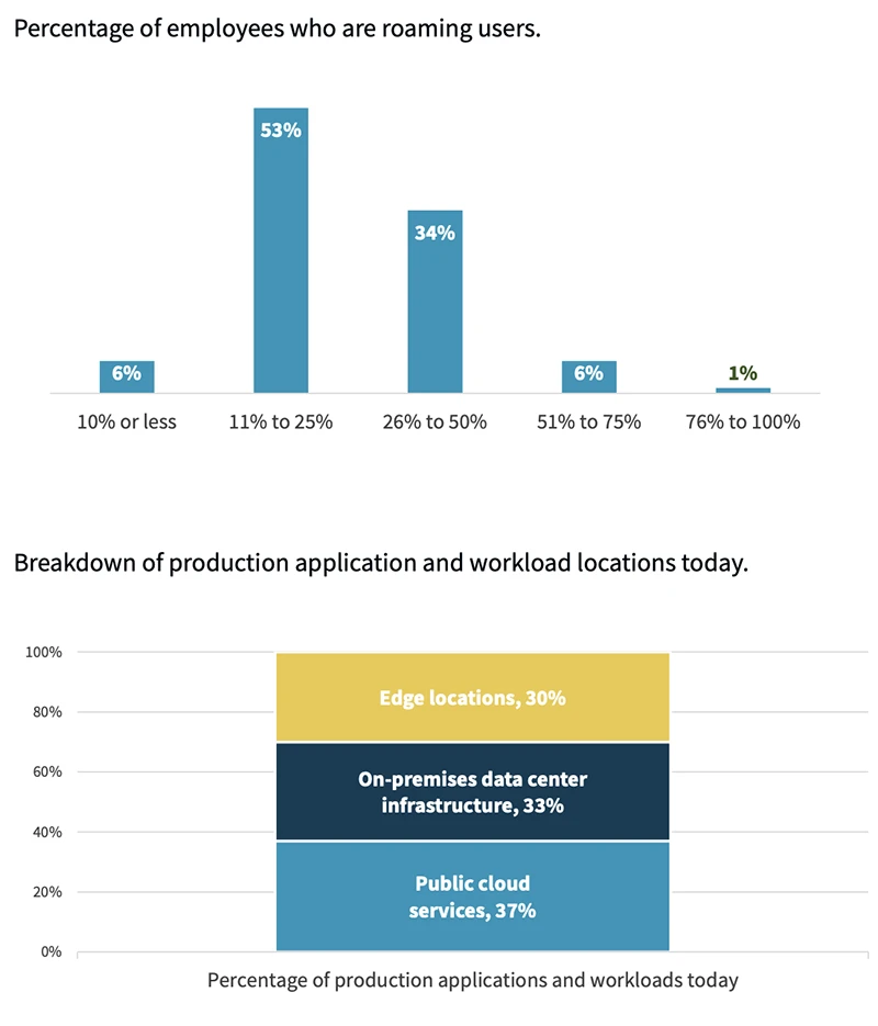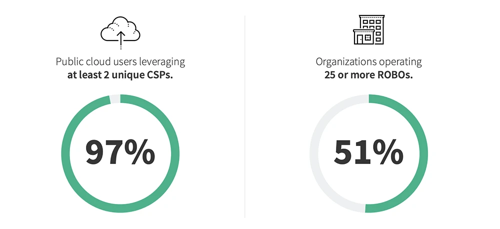 Between public cloud infrastructure services and increasingly hybrid work policies, highly distributed application environments have become the norm and not the exception. Public cloud usage continues to expand, with 97% of current users leveraging at least two unique public clouds, and more than a quarter using four or more. Additionally, edge environments are growing, with 51% of organizations operating at least 25 remote sites, and 41% reporting that more than a quarter of their employees are roaming users, meaning they work outside the confines of an office at least once a week.