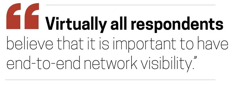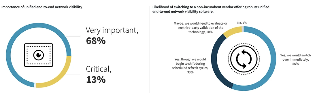Virtually all respondents believe that it is important to have end-to-end network visibility, with two-thirds (68%) identifying it as very important and another 13% calling it critical. End-to-end visibility also plays an important role when considering and selecting new tools. In fact, more than half (56%) of the respondents who believe end-to-end network visibility is important stated they would switch over to a vendor that had that capability immediately, and another third said they would shift during a refresh cycle. This is a clear mandate for end-to-end visibility in modern network environments.