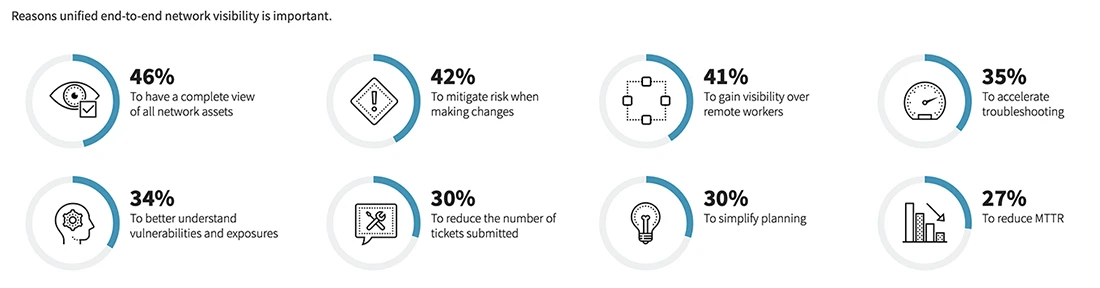 It is clear that end-to-end visibility is important, but why do organizations need it? The most common response was simply to get a complete view of all the network assets. In highly distributed environments, identifying all the devices and remote workers is critical. Other common reasons include the ability to mitigate risk when making changes (42%) and to gain visibility over remote workers (41%), with the latter being critical for organizations with hybrid work initiatives.