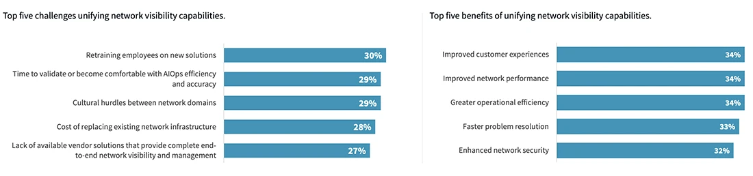 Implementing end-to-end visibility isn’t without its challenges as organizations cite having to retrain employees on new solutions (30%) and the time to validate or become comfortable with AIOps (29%) as issues. Another common challenge is overcoming the cultural hurdles between network domains (29%). And it is worth noting that 27% report a lack of available vendors with a complete solution.