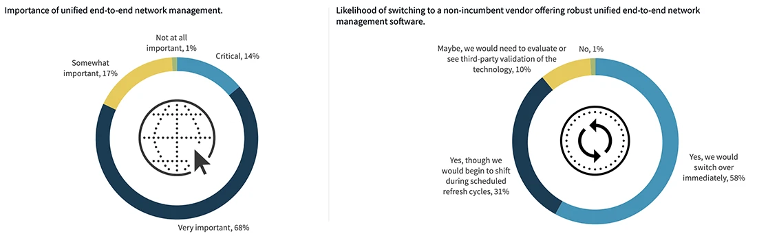 As was the case with network visibility, virtually all respondents believe that it is important to some degree to have end-to-end network management, with more than three-quarters stating it is either very important (68%) or critical (14%). End-to-end management also plays an important role when selecting new tools. More than half (58%) of respondents stated their organization would switch over to a vendor that had that capability immediately. Just less than a third (31%) said they would be more likely to shift during a refresh cycle.