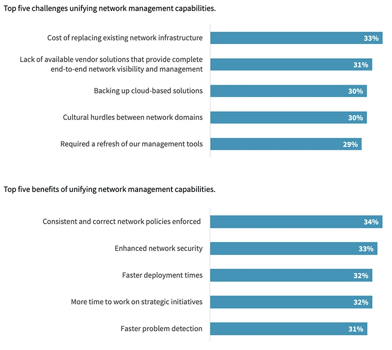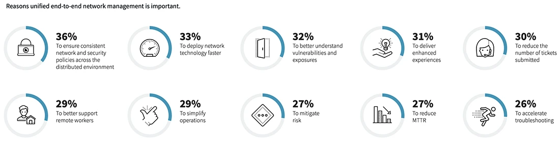 Why is end-to-end network management so important? More than a third (36%) of respondents cited consistent network and security policies across a distributed environment. This makes sense as having centralized control with distributed enforcement is consistently a top priority for network operations teams. Organizations also want to deploy network technologies faster (33%) and better understand vulnerabilities and exposures (32%), which is especially important with the increased attack surface of a distributed environment. Other common reasons for unified network management include the abilities to deliver enhanced experiences (31%), reduce tickets (30%), and better support remote workers (29%).