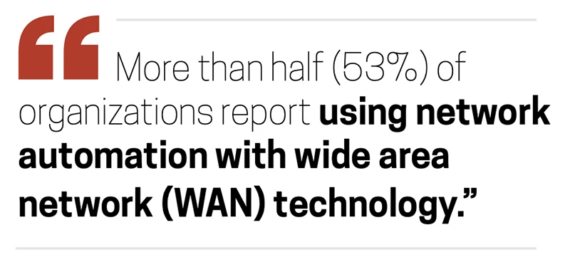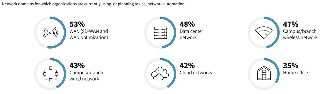 Given the widespread use of network automation, it makes sense to examine the network domains organizations most commonly apply it to. More than half (53%) of organizations report using network automation with wide area network (WAN) technology, and given the distributed nature of these environments, this shouldn’t be a surprise. And despite all the hype about cloud computing, data center networks are next in line to use network automation (48%), followed closely by campus and branch wireless networks (47%).