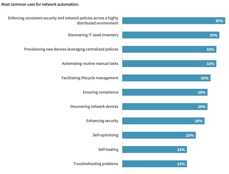 Knowing where automation is used, it also makes sense to investigate why it is used. While topics like self-optimized and self-healing networks get the lion’s share of the attention, most organizations find value first in other use cases. The most common response involves using automation to enforce consistent security and network policies across a highly distributed environment (35%). Following that is the ability to automate IT asset discovery (33%) and provisioning new devices with centralized policies (32%). Other use cases include automating routine manual tasks (34%) and facilitating lifecycle management (30%) or compliance (29%). Not surprisingly, given their more advanced nature, the aforementioned selfoptimizing and self-healing use cases were at the bottom of the list.