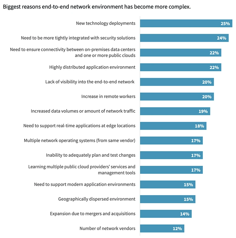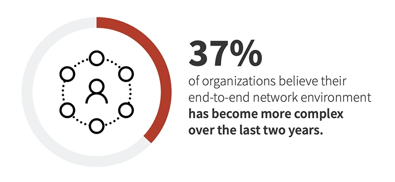 These distributed network environments can drive complexity. Indeed, more than a third of organizations believe their end-to-end network environment has become more complex over the past two years. When asked to identify factors behind this trend, a quarter of these organizations cited the need to deploy new technology. The other most commonly cited reasons included integration with security, ensuring connectivity between data centers and one or more public clouds, distributed application environments, a lack of visibility, and an increase in remote workers.
