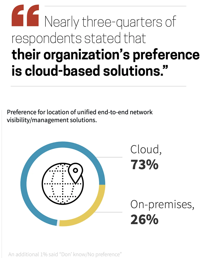 One of the big shifts in network management is the preference to have cloud-based network management solutions. Indeed, nearly three-quarters (73%) of respondents stated that their organization’s preference is cloud-based solutions. When asked about the influences behind this preference, 44% cited lifecycle management and/or the ability to leverage AI/ML technology. With a nod to remote workers (including those in IT operations), cloud-based solutions are easy to access when working remotely (42%), and for those distributed environments, it provides centralized visibility and control (41%).
