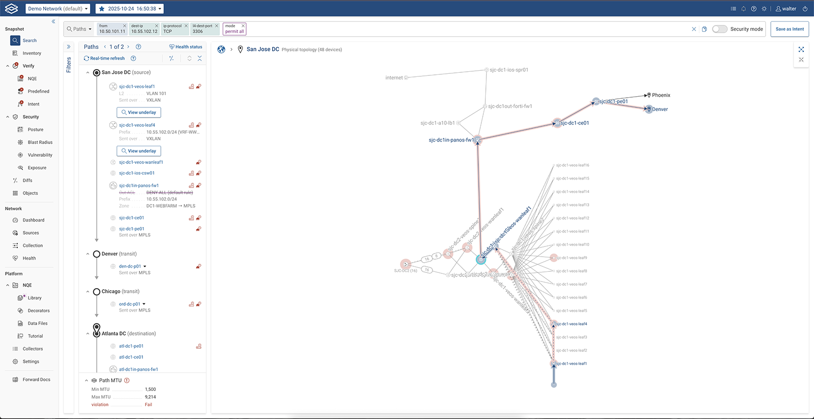 • Continuous verification and compliance: Automatically validate network behavior against policies, SLAs, and regulatory standards (PCI-DSS, HIPAA, STIG, etc.)