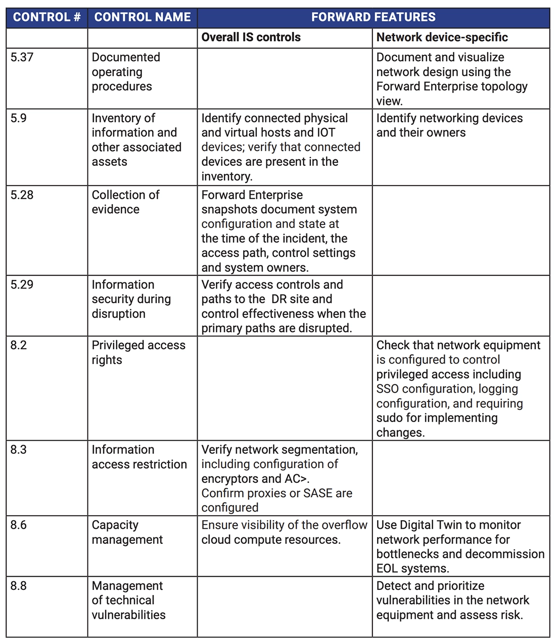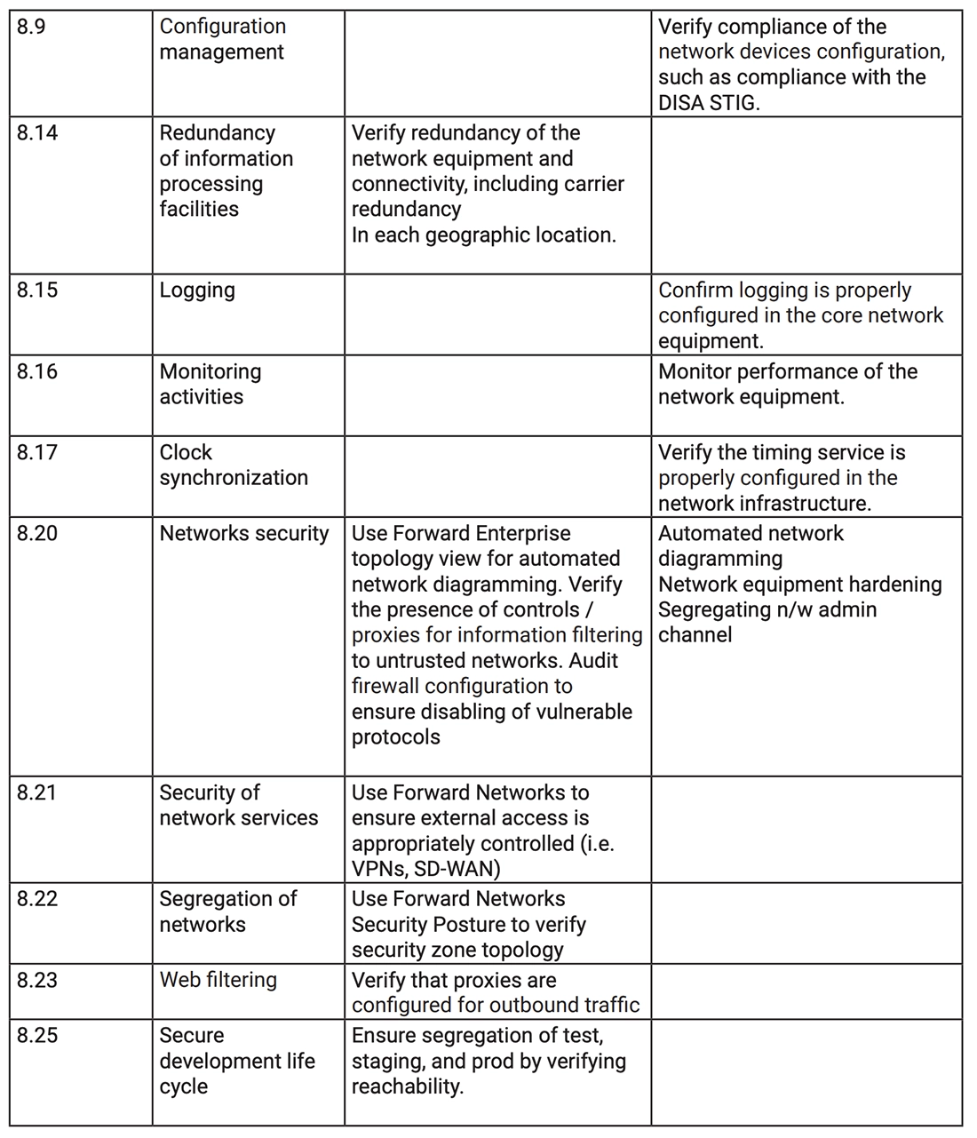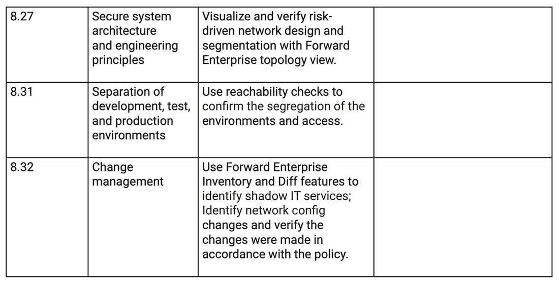 The framework classifies controls into three categories: Preventative, Detective, and Corrective. In this solution brief, we will explain how Forward Enterprise’s features can help implement specific ISO controls. This includes managing network equipment configurations and addressing the 13 controls related to asset reachability and segregation.